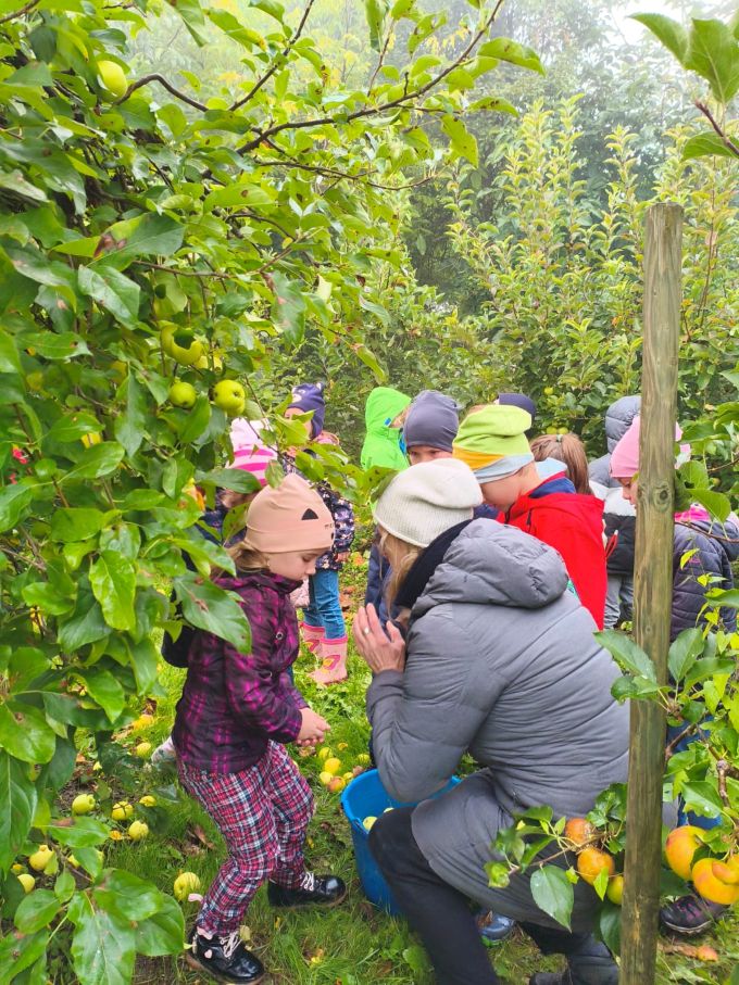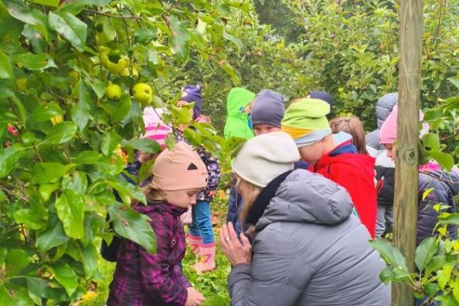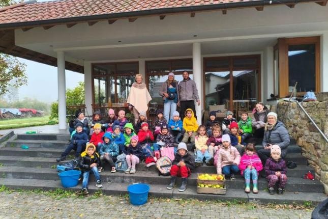 Nach einem herzlichen Empfang mit frisch gepresstem Apfelsaft ernteten die Kinder Äpfel und erfuhren nebenbei viel Wissenswertes rund um den Apfel, zum Beispiel, dass die meisten Vitamine der Äpfel direkt unter der Schale sind.