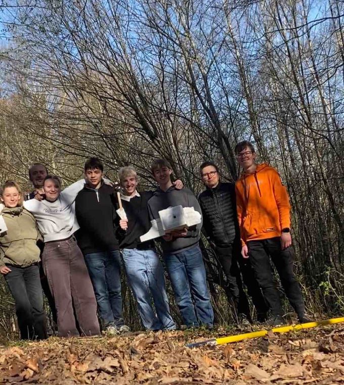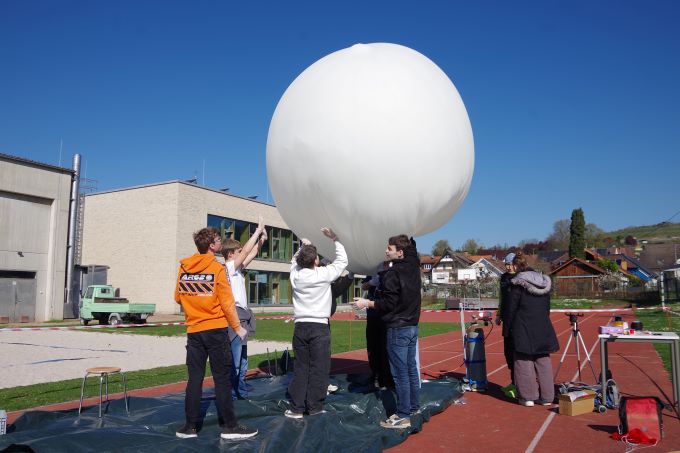 Als der Tag immer näher rückte, stieg die Anspannung und die letzten Vorbereitungen mussten angegangen werden. Als unseren Piloten wählten wir schließlich Frank den Playmobil Stratonauten. Am Mittwoch, den 02.04, konnten wir unsere Sonde dann nach langer Vorbereitung steigen lassen. Der Tag startete mit schönem Sonnenschein, was für uns das perfekte Wetterverhältnis darstellte. Der Großteil half Herrn Schwarzwälder den Ballon mit dem, uns vom Fahrzeughaus Schneider zur Verfügung gestellten Ballongas, zu füllen. Einzelne kümmerten sich dann noch um letzte Kleinigkeiten an der Sonde. Dazu zählte es die Kamera, GPS-Tracker und den Datenlogger einzuschalten. Frank musste einsteigen und dann wurde die Styroporbox zugeklebt. Die Sonde wurde mit dem Fallschirm und dieser mit dem Ballon verbunden. Nach kleineren Problemen, aufgrund des starken Windes, flog unsere Sonde um 11:06 Uhr davon und die Schule staunte ihr hinterher. Zwei Stunden später fuhren wir, die NWT Gruppe, in zwei Autos los über die Grenze nach Frankreich. Immer wieder haben wir geprüft, wo sich unser Ballon befand. Nach mehr als 3 Stunden Fahrt, und einem Zwischenstopp für Croissants, kamen wir an einer Wiese an, wo wir die Sonde schnell durch den leuchtend roten Fallschirm ausfindig machen konnten. Mit verschiedenen Ideen versuchen wir, das Gespann aus dem fast 9 Meter hohen Baum zu bergen. Schlussendlich schafften wir es, mit einer Teleskopstange die Sonde aus dem Baum zu holen. Noch vor Ort öffneten wir die Sonde und fanden Frank heil vor. Auf der 2 stündigen Fahrt zurück zur Schule werteten wir die Messwerte und Aufnahmen erstmals aus. Jetzt nach dem Projekt geht es darum, aus den Aufnahmen einen Film zu schneiden, eine Kostenzusammenstellung zu schreiben und für die Schulgemeinschaft offene Aufsteller und Plakate zu erstellen.Nochmals ein großes Danke an das Fahrzeughaus Schneider für das gesponserte Helium.