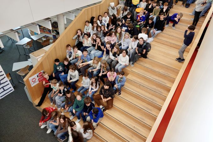 Mit einer feierlichen Übergabe auf der Lerntreppe des Neubaus erhielten 120 Schülerinnen und Schüler der Lerngruppen 5 & 6 neue Metallflaschen. An besonders heißen Tagen kann somit ab sofort unkompliziert Wasser aus dem Trinkwasserbrunnen geholt werden, das lästige Suchen nach Trinkbechern entfällt somit.