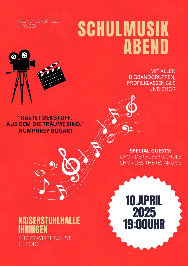 Hollywood trifft Kaiserstuhl – unter dem Motto „Filmmusik live!“ lädt die Neunlindenschule Ihringen am 10. April um 19 Uhr zum musikalischen Höhepunkt des Schuljahres in die Kaiserstuhlhalle Ihringen ein.