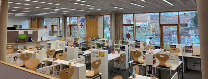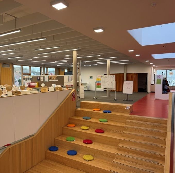 Persönliche Arbeitsplätze bieten Orientierung und Ruhe. Lernorte können bewusst gewählt und bei Bedarf gewechselt werden. Während der Arbeitsphasen gilt das Prinzip des Flüsterns, um konzentriertes Arbeiten zu ermöglichen.